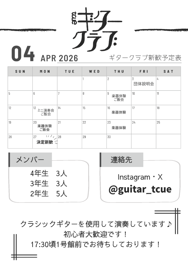 - 2026年新入生歓迎会を開催します4月からの定期演奏会スケジュールが決定しました。 ギタークラブは部員のほとんどがギター未経験です。先輩社員がや… 続きを読む: 2026年新入生歓迎会を開催します
